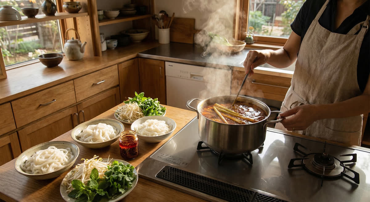 また、自宅で作る場合は、アジア食材店でブンの乾麺、レモングラス、マムルオック(エビペースト)を購入できます。最近では、ブンボーフエ専用のスープの素(ペースト)も販売されており、手軽に本格的な味を再現できるようになっています。
